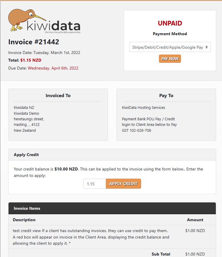 Client outstanding invoices, you can use credit to pay them. A red box will appear on the invoice in the Client Area, displaying the credit balance and allowing you to buy the credit