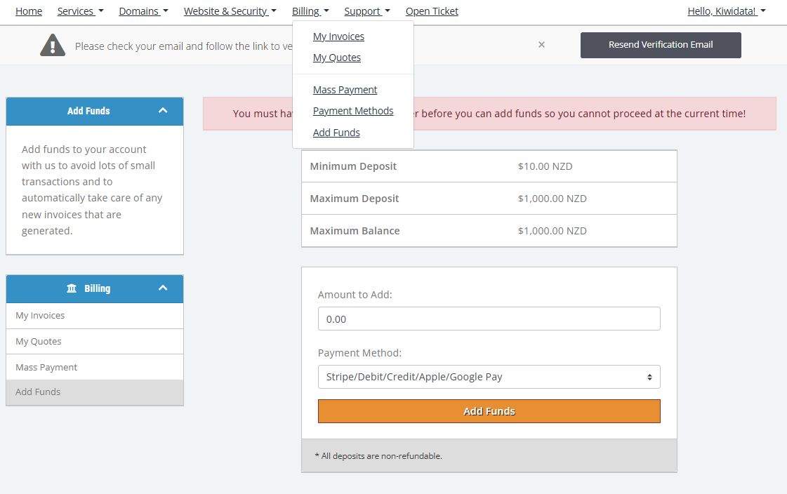 To add funds in the Client Area: