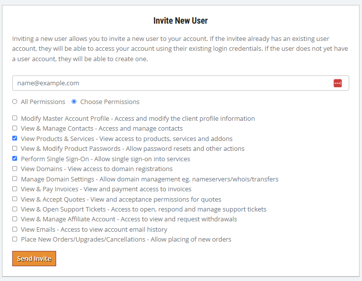 - Choose the permissions (e.g., DNS, cPanel, Virtual servers, backups Domains, billing, support).